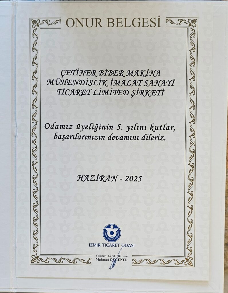 ÇETİNER BİBER MAKİNA MÜHENDİSLİK olarak, şirketimizin kuruluşunun 5. yılını geride bırakmanın gururunu yaşıyoruz. Geride bıraktığımız bu süre zarfında, sektörden ve değerli iş ortaklarımızdan aldığımız destek ve rehberlik için derin şükranlarımızı sunarız. Şirketimiz, bu süreçte elde ettiği başarılarla birlikte İzmir iş dünyasının gelişimine yönelik yürütülen tüm çalışmaları takdirle takip etmektedir. Bizim için başarı, yalnızca kendi büyümemizle sınırlı olmayıp, faaliyet gösterdiğimiz çevrenin ve ekosistemin ilerlemesiyle de yakından ilişkilidir. Bu vizyonla, İzmir iş dünyasındaki tüm paydaşlarımızın başarılarının devamını diliyoruz. ÇETİNER BİBER MAKİNA olarak, önümüzdeki nice yıllarda da sektördeki gelişime öncülük etmeye, inovatif çözümler üretmeye ve sizlerle birlikte daha büyük başarılara imza atarak büyümeye devam etmeyi hedefliyoruz.
